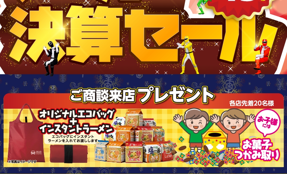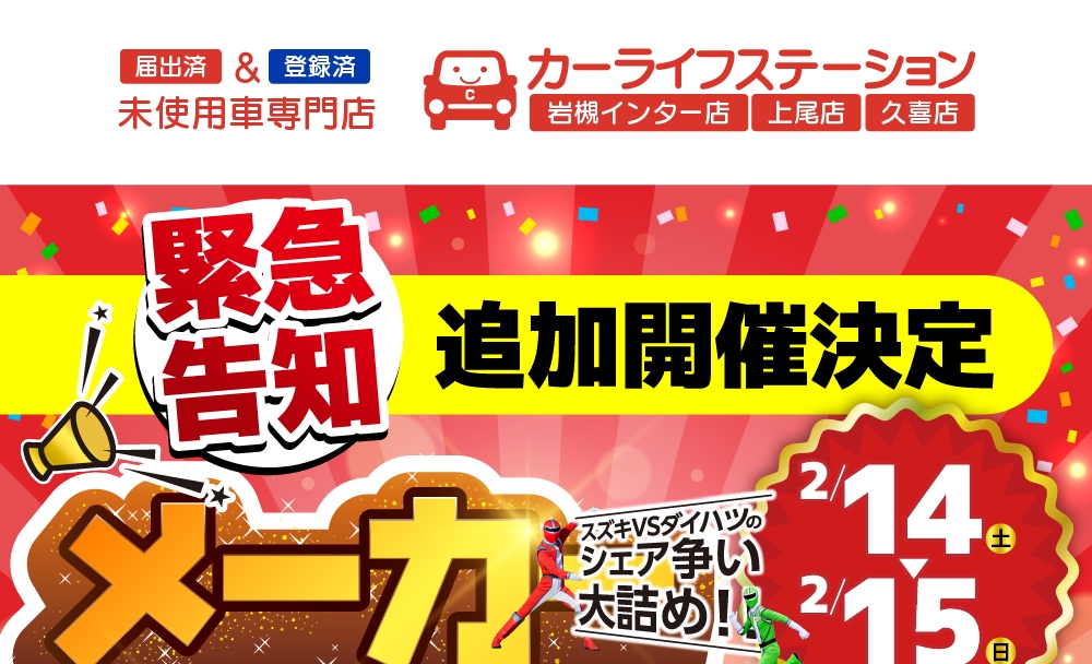 緊急告知!メーカー決算セール追加開催決定! 2026年2月10日 最終更新日時 : 2026年2月10日 カーライフステーション それでも、今回のセール期間中ご来店が難しい方ぜひ、ご連絡ください 極力、ご要望にお応えできるよう、ご相談させていただきます 岩槻インター店:0120-344-713 上 尾 店:0120-344-860 久 喜 店:0120-344-820